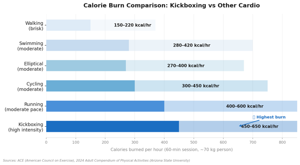 According to the American Council on Exercise (ACE), a person weighing around 57kg burns approximately 350–450 calories in a one-hour cardio kickboxing session. At higher body weights and higher intensities, that number rises meaningfully. A 70kg individual burns approximately 371 calories in just 30 minutes based on kickboxing’s MET value of 10.6, as recorded in the 2024 Adult Compendium of Physical Activities from Arizona State University. For a full 60-minute session at conditioning intensity, a 70kg person can expect to burn in the region of 450–650 calories, depending on effort level, round structure, and rest intervals.